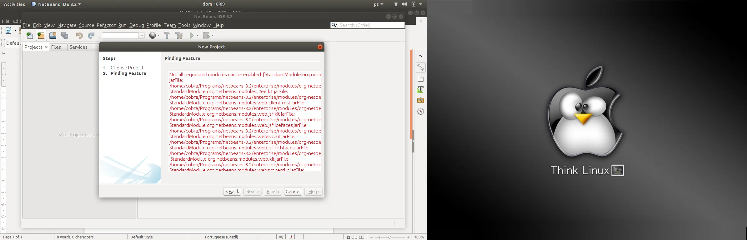 to usando ubuntu e o netbeans nao abre novo projeto java (java, web ou enterprise). dá um erro de “not all requested modules can be enabled”, e tem uma listagem de erros, todas de jarFile