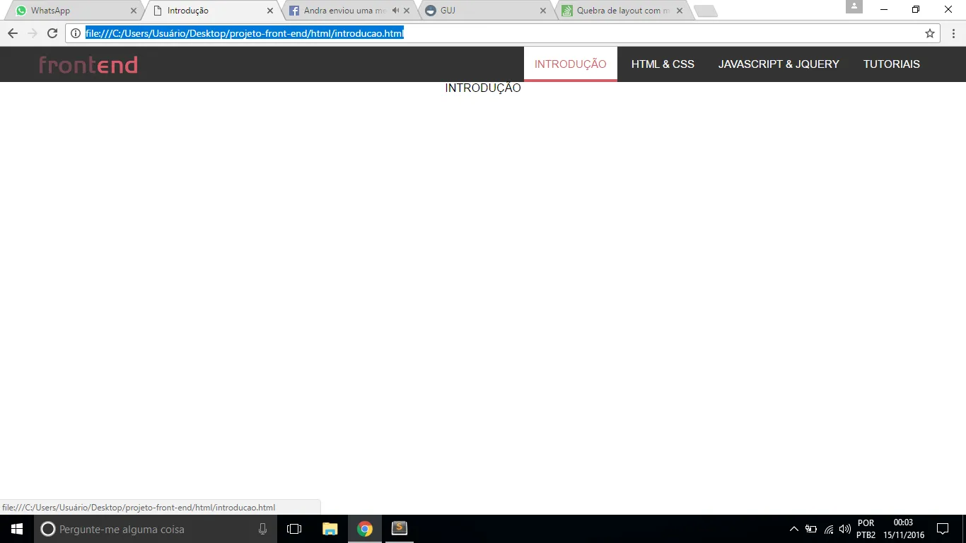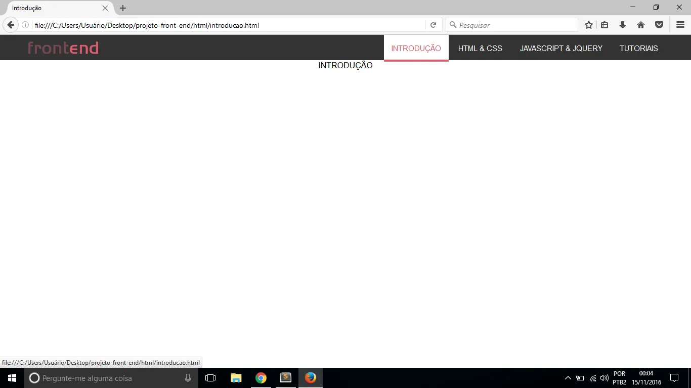 > <!DOCTYPE html> > <html> > <head> > <title>Introdução</title> > <meta charset="utf-8"> > <link rel="stylesheet" type="text/css" href="../css/menu.css"> > </head> > <body> > <header> > <nav id="menu-principal"> > <figure id="logo"> > <h1><a href="index.html"><img src="../image/logo.png" alt="Logomarca Front-End Development"></a></h1> > </figure> > <ul id="lista-menu"> > <li><a href="introducao.html">INTRODUÇÃO</a></li> > <li><a href="html&css.html">HTML & CSS</a></li> > <li><a href="js&jquery.html">JAVASCRIPT & JQUERY</a></li> > <li><a href="tutoriais.html">TUTORIAIS</a></li> > </ul> > </nav> > </header> > <div class="content"> > <p style="text-align:center;">INTRODUÇÃO</p> > </div> > </body> > </html>
