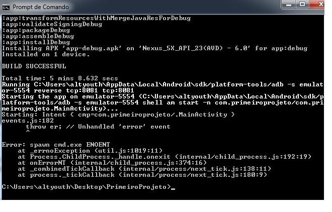 Bom, eu vou começar a usar o react, só q tá acontecendo um problema na hora de eu executar o meu primeiro programa via terminal. Eu digito o comando “react-native run-android” mas no final ele aponta um erro: Error: spawn cmd.exe ENOENT. segue a imagem com o erro no terminal