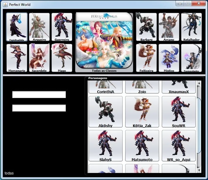Em sua Tela Principal possuo 13 JButtons, 12 deles distribuidos em cada uma das 12 classes existentes no jogo e, ao clicar, buscam em meu banco de dados (PostgreSQL) os Personagens que possuo para a classe determinada. O 13° JButton busca todos os Personagens do Banco.