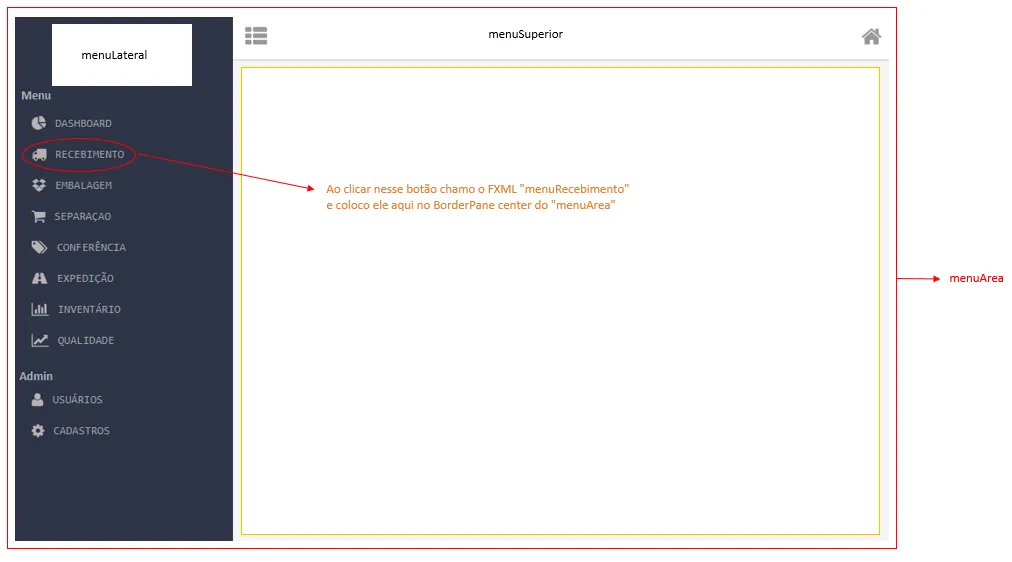 Até aqui tudo ok, porém no menu lateral tem vários botões, a ideia é cada botão chamar uma tela correspondente e adicionar na parte central do FXML “menuArea” lembrando que o “menuArea” é um BorderPane que já tem o top com o fxml “menuSuperior” e já tem o left com o fxml “menuLateral”.