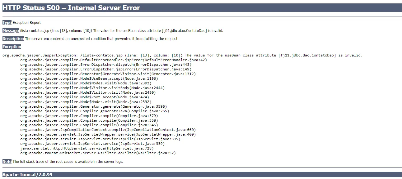 org.apache.jasper.JasperException: /lista-contatos.jsp (line: [13], column: [10]) The value for the useBean class attribute [fj21.jdbc.dao.ContatoDao] is invalid.