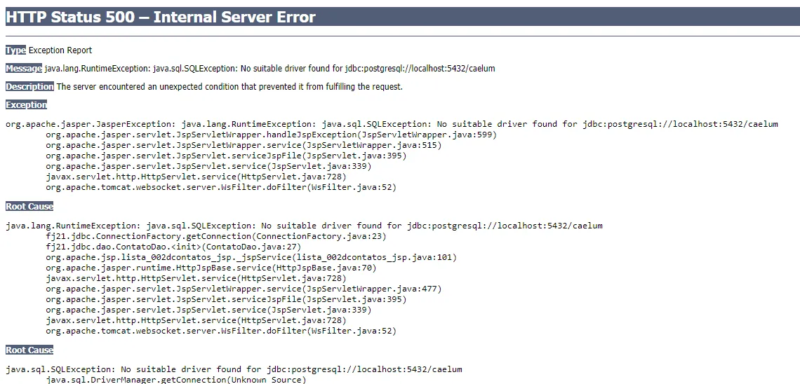 org.apache.jasper.JasperException: java.lang.RuntimeException: java.sql.SQLException: No suitable driver found for jdbc:postgresql://localhost:5432/caelum org.apache.jasper.servlet.JspServletWrapper.handleJspException(JspServletWrapper.java:599) org.apache.jasper.servlet.JspServletWrapper.service(JspServletWrapper.java:515) org.apache.jasper.servlet.JspServlet.serviceJspFile(JspServlet.java:395) org.apache.jasper.servlet.JspServlet.service(JspServlet.java:339) javax.servlet.http.HttpServlet.service(HttpServlet.java:728) org.apache.tomcat.websocket.server.WsFilter.doFilter(WsFilter.java:52)