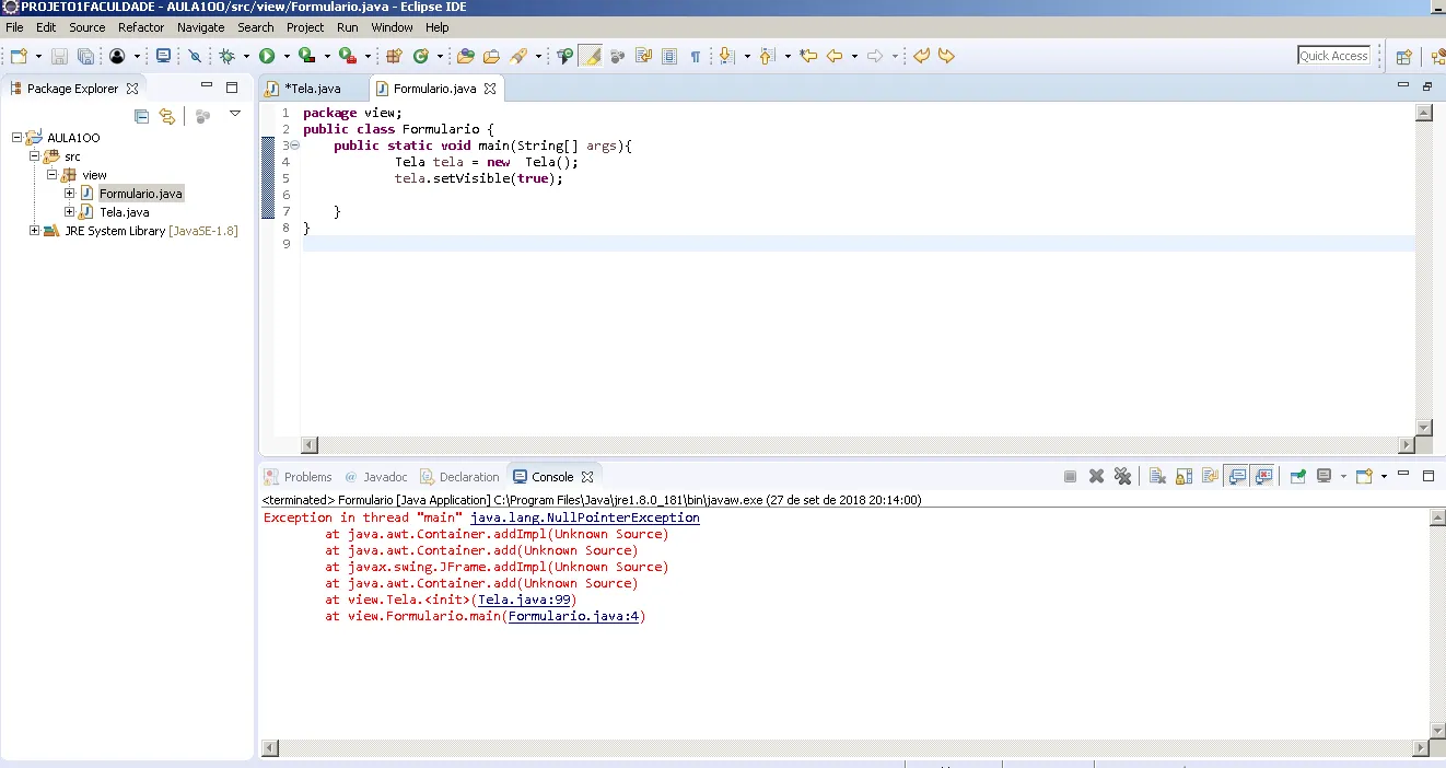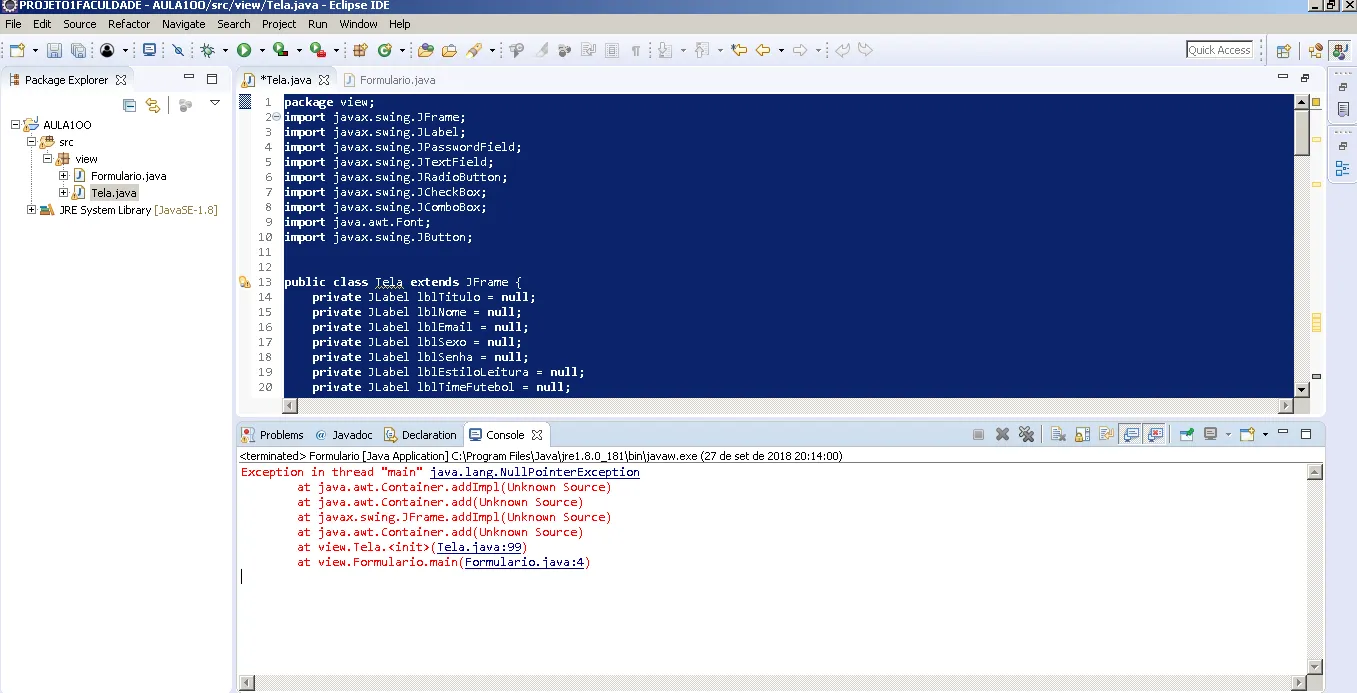 Estou tendo uma aula da facul de GUI, fiz tudo igual, estou usando o Eclipse, mas quando vou executar não roda…
