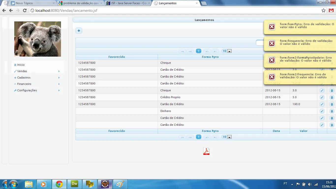 e ai galera. seguinte quando submeto meu formulario ele da erro de validação no selectOneMenu… não to usando pojo coloco o selectItem na mão mesmo… vai ter gente que vai pedir pra eu substituir o hash e o equal. ja fiz isso ja e nada ainda. uma coisa engraçado é que incluir funciona normal, agora qndo faço um update ele da a msg de validação.