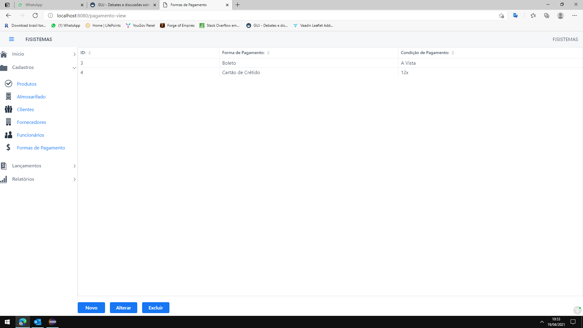 Criei um tela para cadastrar formas de pagamento. Segue tela:
