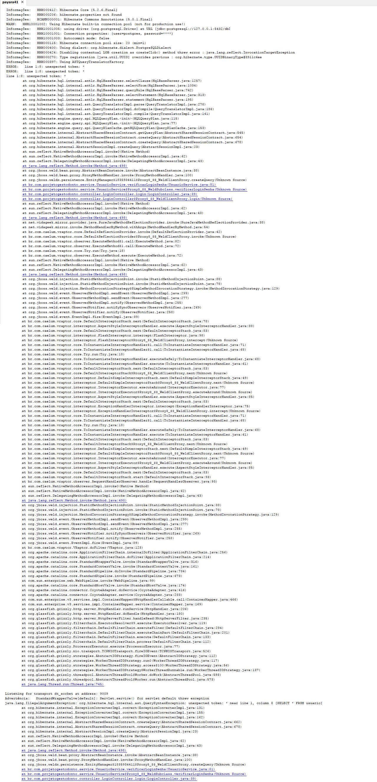 java.lang.IllegalArgumentException: org.hibernate.hql.internal.ast.QuerySyntaxException: unexpected token: * near line 1, column 8 [SELECT * FROM usuario]