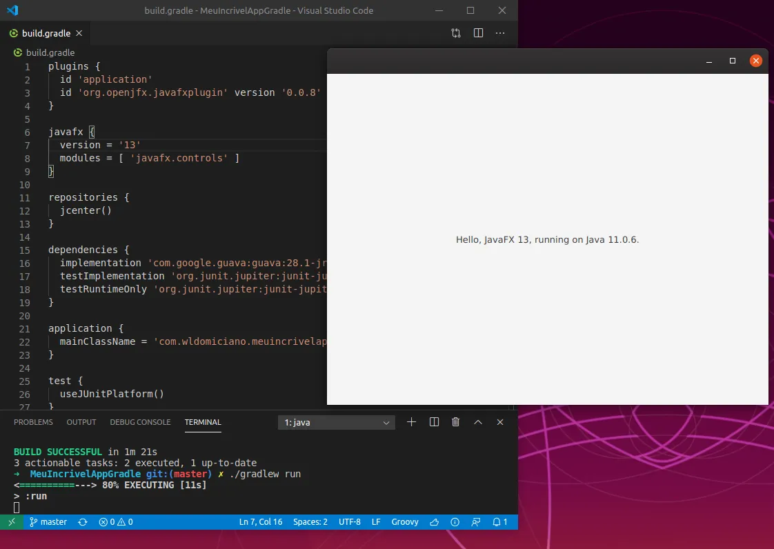 A propóstio ao rodar seu projeto na GUI foi exibido o seguinte: Hello, JavaFX 10.0.2-internal, running on Java 11.0.5. mesmo tendo a versao 13 declarada no build.gradle