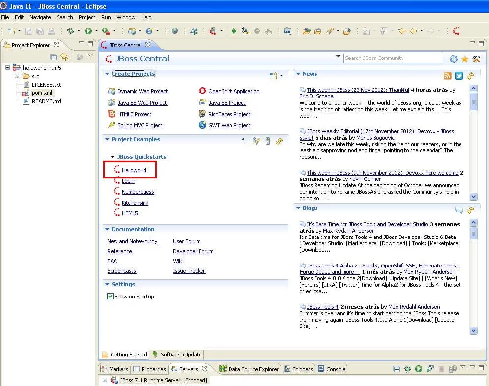 Pessoal, estou tentando aprender a trabalhar com JBoss. Baixei ontem a versão JBoss AS 7.1, incorporei o plugin do JBoss Tools no Eclipse Indigo pelo Market Place.