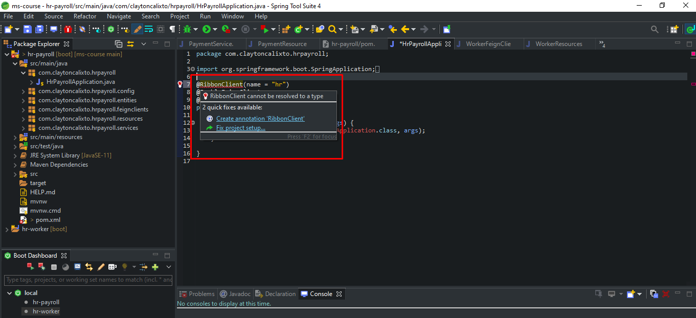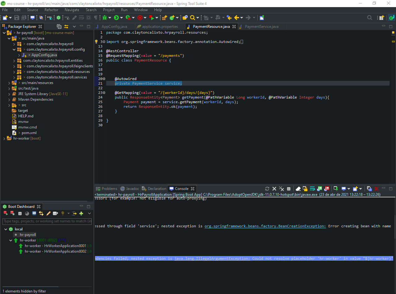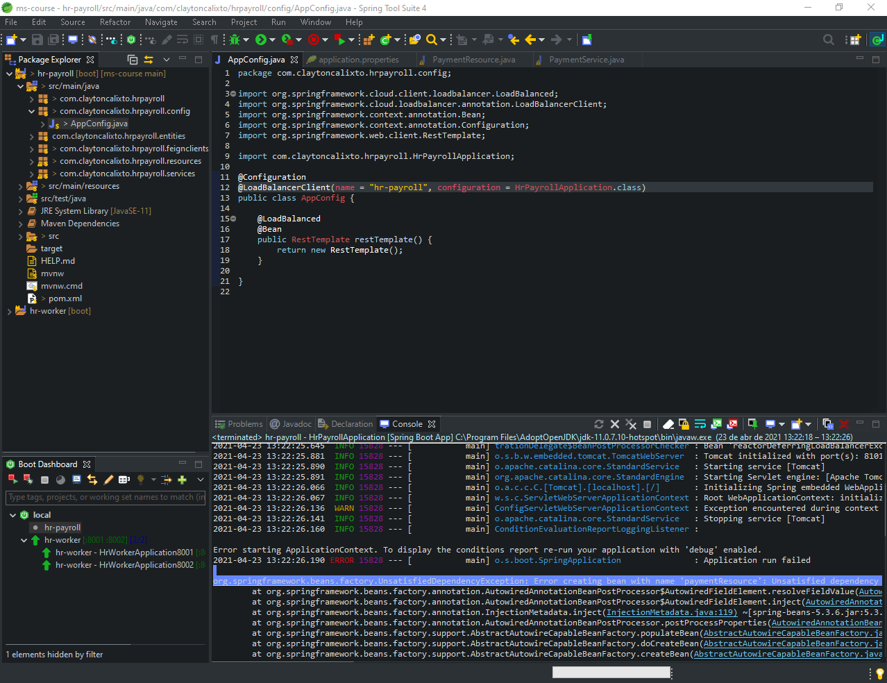Apresenta: org.springframework.beans.factory.UnsatisfiedDependencyException: Error creating bean with name 'paymentResource': Unsatisfied dependency expressed through field 'service'; nested exception is org.springframework.beans.factory.NoSuchBeanDefinitionException: No qualifying bean of type 'com.claytoncalixto.hrpayroll.services.PaymentService' available: expected at least 1 bean which qualifies as autowire candidate. Dependency annotations: {@org.springframework.cloud.client.loadbalancer.LoadBalanced(), @org.springframework.beans.factory.annotation.Autowired(required=true)}