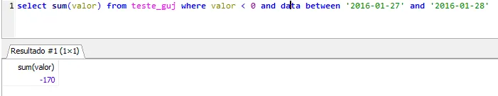 Quero somar apenas os valores das despesas nessa tabela limitando a pesquisa por data. No exemplo acima se eu limitasse a pesquisa do dia 01 ao 02 com um sum() simples iria dar um saldo geral, mas queria o resultado apenas das despesas.