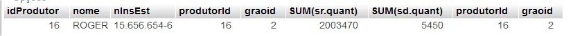 select p.idProdutor, p.nome, p.nInsEst, sr.produtorId, sr.graoid, SUM(sr.quant), sd.produtorId, sd.graoid, SUM(sd.quant) from produtor p inner join remessa sr on sr.produtorId = p.idProdutor and sr.graoId = 2 inner join devolucao sd on sd.produtorId = p.idProdutor and sd.graoId = 2 group by p.idProdutor