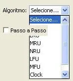 cbAlgoritmo.setModel(new javax.swing.DefaultComboBoxModel(new String[] { “Selecione…”, “FIFO”, “LRU”, “MRU”, “NRU”, “LFU”, “MFU”, “Clock”, “Ótimo” }));