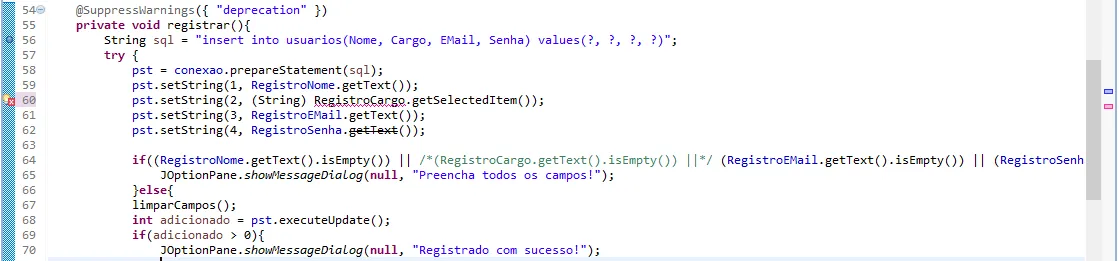 2 String sql = "insert into usuarios(Nome, Cargo, EMail, Senha) values(?, ?, ?, ?)";