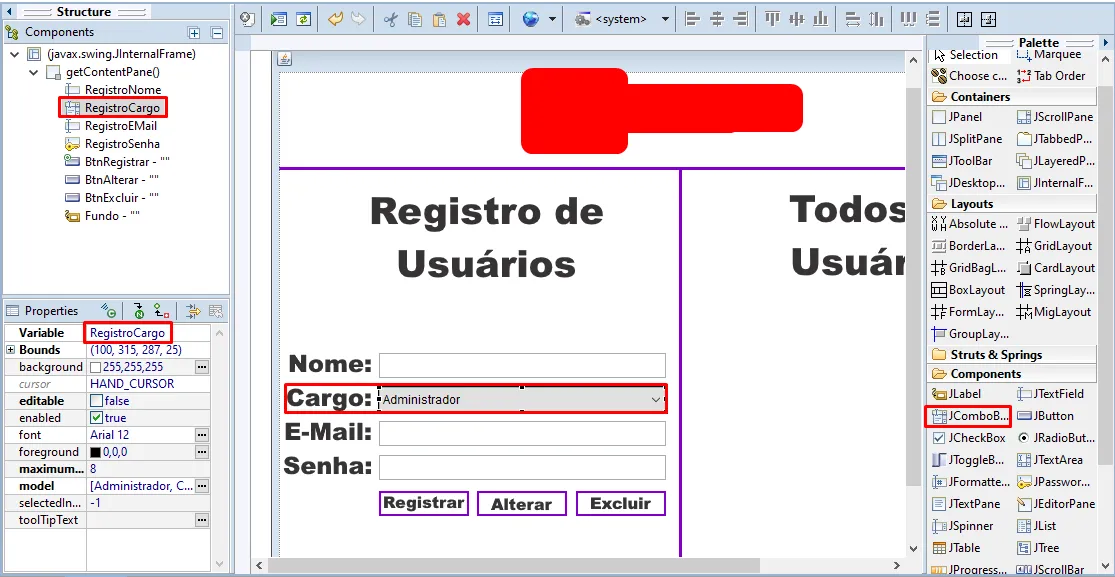 Olá, estou fazendo um programa onde o administrador pode registrar outros usuários, o administrador insere o nome, cargo, e-mail e senha, ai ao salvar ele registra no banco de dados, no cargo, ele é um JComboBox onde o administrador escolhe se o outro usuário será um administrador ou um caixa, porém não estou conseguindo fazer com que ele pegue o texto do JComboBox e salva no banco de dados (Linha 6), segue o código da parte de registro: