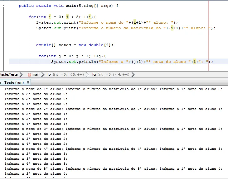 for(inti=0;i<5;++i){System.out.println("Informe o nome do "+(i+1)+"º aluno: ");StringnomeAluno=sc.next();System.out.println("Informe o número da matrícula do "+(i+1)+"º aluno: ");intnumMatricula=sc.nextInt();double[]notas=newdouble[4];for(intj=0;j<4;++j){System.out.println("Informe a "+(j+1)+"º nota do aluno "+nomeAluno+": ");notas[j]=sc.nextDouble();}}// TODO code application logic here}