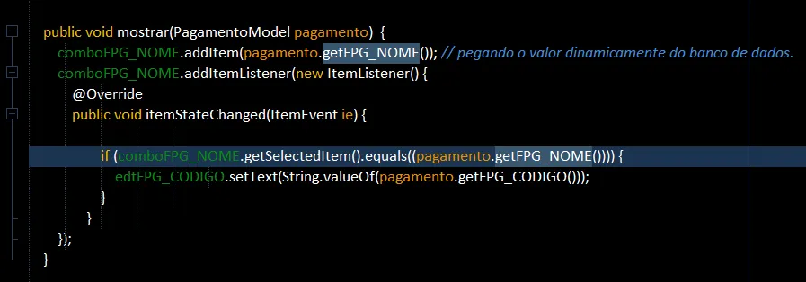 Estou com o seguinte problema, eu tenho que preencher um JTextField com o ID de uma forma de pagamento, o processo seria o seguinte quando selecionado no JComboBox a forma de pagamento no campo ao lado que seria o JTextField apareceria o ID dessa forma por exmplo
