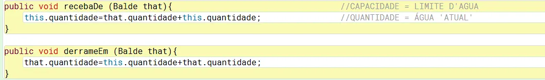 Até então eu tinha conseguido concluir sem dificuldade, o problema é que agora eu percebi que quando eu passo a quantidade de litros d’agua de um balde cheio que tem a capacidade maior que outro, o que tem a capacidade menor fica com uma quantidade maior do que o próprio limite, algo que é absurdo e precisa ser corrigido.