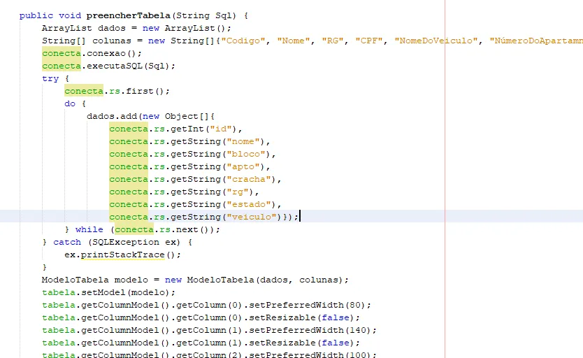 ArrayListdados=newArrayList();String[]colunas=newString[]{"Codigo","Nome","RG","CPF","NomeDoVeiculo","NúmeroDoApartamneto","NúmeroDaCasa","Placa"};conex.conecta();conex.executaSql(Sql);try{conex.rs.first();do{dados.add(newObject[]{conex.rs.getInt("codigo"),conex.rs.getString("nome"),conex.rs.getString("rg"),conex.rs.getString("cpf"),conex.rs.getString("nomedoveiculo"),conex.rs.getString("númerodoapartamento"),conex.rs.getString("númerodacasa"),conex.rs.getString("placa")});}while(conex.rs.next());}catch(SQLExceptionex){JOptionPane.showMessageDialog(rootPane,"Busque por outro morador para preencher tabela");}ModeloTabelamodelo=newModeloTabela(dados,colunas);jTableMoradores.setModel(modelo);jTableMoradores.getColumnModel().getColumn(0).setPreferredWidth(80);jTableMoradores.getColumnModel().getColumn(0).setResizable(false);jTableMoradores.getColumnModel().getColumn(1).setPreferredWidth(140);jTableMoradores.getColumnModel().getColumn(1).setResizable(false);jTableMoradores.getColumnModel().getColumn(2).setPreferredWidth(100);jTableMoradores.getColumnModel().getColumn(2).setResizable(false);jTableMoradores.getColumnModel().getColumn(3).setPreferredWidth(100);jTableMoradores.getColumnModel().getColumn(3).setResizable(false);jTableMoradores.getColumnModel().getColumn(4).setPreferredWidth(122);jTableMoradores.getColumnModel().getColumn(4).setResizable(false);jTableMoradores.getColumnModel().getColumn(5).setPreferredWidth(164);jTableMoradores.getColumnModel().getColumn(5).setResizable(false);jTableMoradores.getColumnModel().getColumn(6).setPreferredWidth(144);jTableMoradores.getColumnModel().getColumn(6).setResizable(false);jTableMoradores.getColumnModel().getColumn(7).setPreferredWidth(114);jTableMoradores.getColumnModel().getColumn(7).setResizable(false);jTableMoradores.getTableHeader().setReorderingAllowed(false);jTableMoradores.setAutoResizeMode(jTableMoradores.AUTO_RESIZE_OFF);jTableMoradores.setSelectionMode(ListSelectionModel.SINGLE_SELECTION);conex.desconecta();}