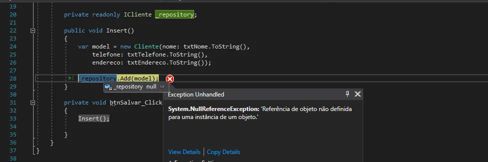 Estou criando uma tela só de cadastro básico inicial em Windows Form C#, estou usando uma interface e um repositório e o DbContext. mas quando estou tentando salvar o repositório me retorna essa mensagem. System.NullReferenceException: ‘Referência de objeto não definida para uma instância de um objeto.’