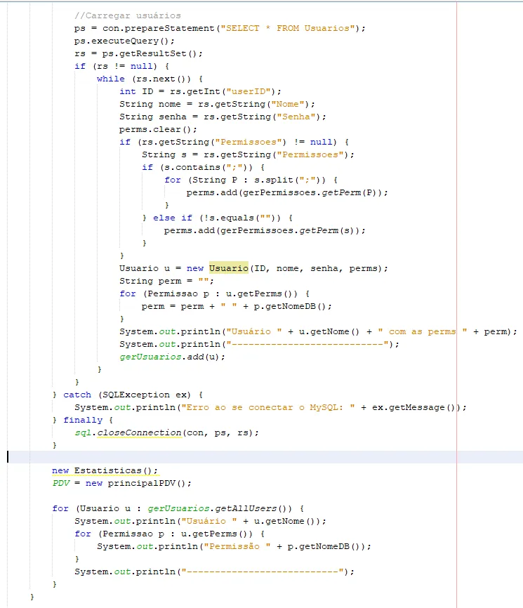 //Carregar usuáriosps=con.prepareStatement("SELECT * FROM Usuarios");ps.executeQuery();rs=ps.getResultSet();if(rs!=null){while(rs.next()){intID=rs.getInt("userID");Stringnome=rs.getString("Nome");Stringsenha=rs.getString("Senha");perms.clear();if(rs.getString("Permissoes")!=null){Strings=rs.getString("Permissoes");if(s.contains(";")){for(StringP:s.split(";")){perms.add(gerPermissoes.getPerm(P));}}elseif(!s.equals("")){perms.add(gerPermissoes.getPerm(s));}}Usuariou=newUsuario(ID,nome,senha,perms);Stringperm="";for(Permissaop:u.getPerms()){perm=perm+" "+p.getNomeDB();}System.out.println("Usuário "+u.getNome()+" com as perms "+perm);System.out.println("---------------------------");gerUsuarios.add(u);}}}catch(SQLExceptionex){System.out.println("Erro ao se conectar o MySQL: "+ex.getMessage());}finally{sql.closeConnection(con,ps,rs);}newEstatisticas();PDV=newprincipalPDV();for(Usuariou:gerUsuarios.getAllUsers()){System.out.println("Usuário "+u.getNome());for(Permissaop:u.getPerms()){System.out.println("Permissão "+p.getNomeDB());}System.out.println("---------------------------");}