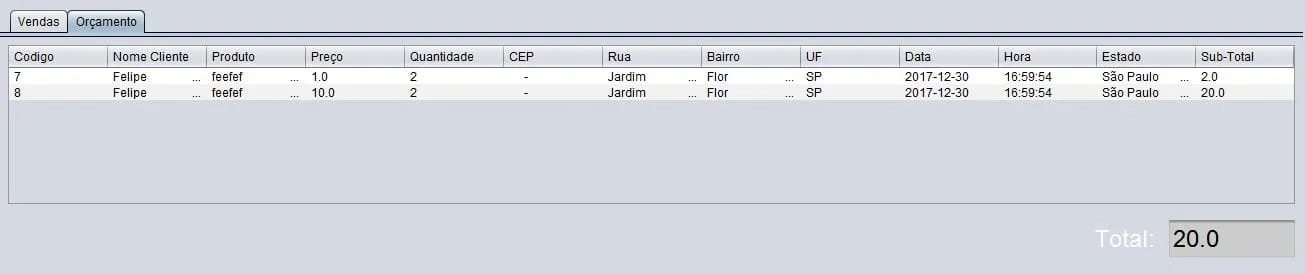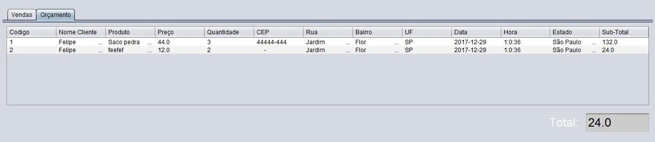 Visitasvisi=newVisitas();DefaultTableModelmodelo;String[]titulos={"Codigo","Nome do Cliente","Produto","Preço","Qtde","Cep","Bairro","Endereço","Estado","Uf","Data","Hora"};String[]registro=newString[12];modelo=newDefaultTableModel(null,titulos);intcodigo=Integer.parseInt(txtCodigo.getText());Stringnome=txtCliente.getText();Stringprodutos=jComboBox1.getSelectedItem().toString();doublepreço=Double.parseDouble(txtPreco.getText());intqtde=Integer.parseInt(txtQuantidade.getText());Stringcep=txtCep.getText();Stringbairro=txtBairro.getText();Stringrua=txtRua.getText();Stringestado=txtEstado.getText();Stringuf=txtUf.getText();Stringdata=lblData.getText();Stringhora=lblHora.getText();modelo=(DefaultTableModel)jTable2.getModel();doubleresultado=preço*qtde;modelo.addRow(newObject[]{codigo,nome,produtos,preço,qtde,cep,bairro,rua,uf,data,hora,estado,resultado});for(inti=0;i<jTable2.getRowCount();i++){doubleresultado2=0;resultado2=resultado2+Double.parseDouble(jTable2.getValueAt(i,12).toString());txtResultado.setText(String.valueOf(resultado2));}returnmodelo;}privatevoidjButton2ActionPerformed(java.awt.event.ActionEventevt){// TODO add your handling code here:adicionarProdutosOrcamento();