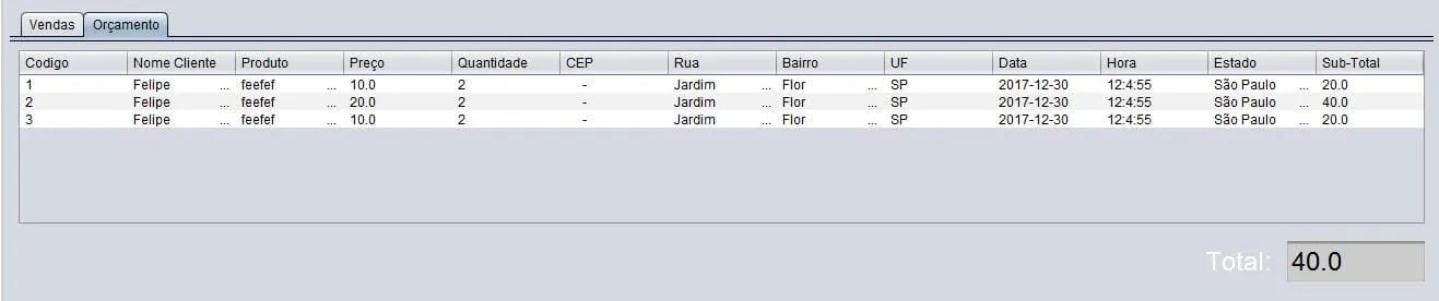 publicDefaultTableModeladicionarProdutosOrcamento(){Visitasvisi=newVisitas();DefaultTableModelmodelo;String[]titulos={"Codigo","Nome do Cliente","Produto","Preço","Qtde","Cep","Bairro","Endereço","Estado","Uf","Data","Hora"};String[]registro=newString[12];modelo=newDefaultTableModel(null,titulos);intcodigo=Integer.parseInt(txtCodigo.getText());Stringnome=txtCliente.getText();Stringprodutos=jComboBox1.getSelectedItem().toString();doublepreço=Double.parseDouble(txtPreco.getText());intqtde=Integer.parseInt(txtQuantidade.getText());Stringcep=txtCep.getText();Stringbairro=txtBairro.getText();Stringrua=txtRua.getText();Stringestado=txtEstado.getText();Stringuf=txtUf.getText();Stringdata=lblData.getText();Stringhora=lblHora.getText();modelo=(DefaultTableModel)jTable2.getModel();doubleresultado=preço*qtde;modelo.addRow(newObject[]{codigo,nome,produtos,preço,qtde,cep,bairro,rua,uf,data,hora,estado,resultado});txtResultado.setText(String.valueOf(resultado));doubleresultadoAtual=Double.parseDouble(txtResultado.getText());resultadoAtual+=(preço*qtde);txtResultado.setText(String.valueOf(resultadoAtual));returnmodelo;}privatevoidjButton2ActionPerformed(java.awt.event.ActionEventevt){// TODO add your handling code here:adicionarProdutosOrcamento();}