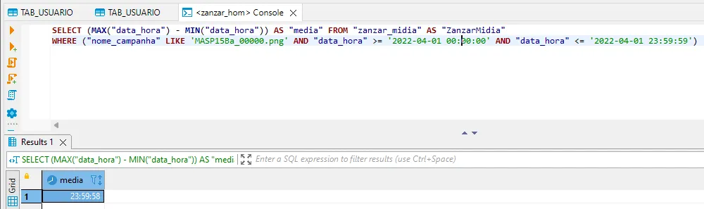 No console mostra assim: Executing (default): SELECT (MAX(“data_hora”) - MIN(“data_hora”)) AS “media” FROM “zanzar_midia” AS “ZanzarMidia” WHERE (“nome_campanha” LIKE ‘MASP15Ba_00000.png’ AND “data_hora” >= ‘2022-04-01 00:00:00’ AND “data_hora” <= ‘2022-04-01 23:59:59’);