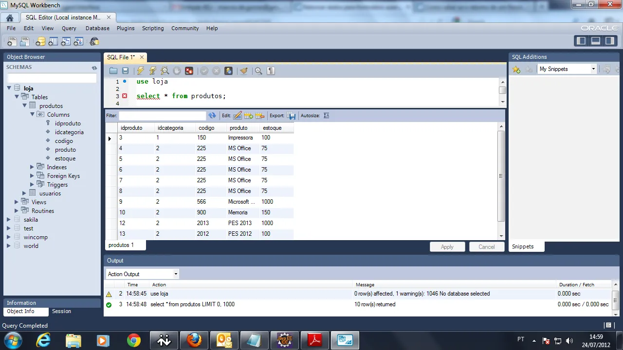 Stringquery="Select idproduto, idcategoria, codigo, produto, estoque FROM produtos";