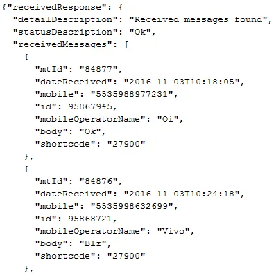 Primeiro, você recebe um envelope com o objeto receivedResponse, que contém detailDescription, statusDescription e receivedMessages.