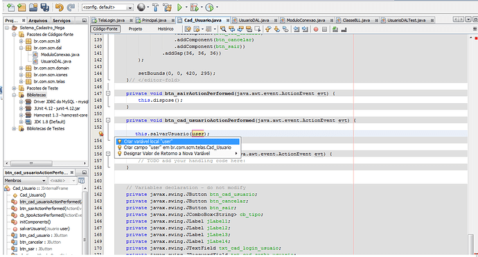 ola pessoa sou novo aqui no GUJ, e estou com um dificuldade. eu estou criando um sistema de cadastro com java em 3 camadas para uma amiga. o sistema tem um login e algumas permissões de usuário. eu criei o login no banco e esta logando normal e chamando a aplicação, o problema e que estou criando a tela de novo usuário, me apresenta a mensagem de cadastrado mas quando olho no banco não salvou nada la. se alguém puder dar uma olhada no meu código e me orientar o que esta errado eu agradeço muito.