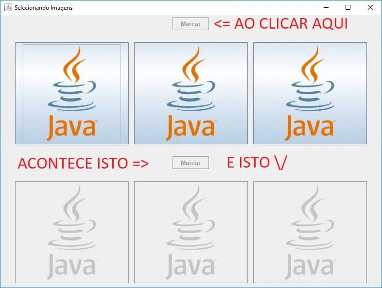 importjava.awt.BorderLayout;importjava.awt.Component;importjava.awt.FlowLayout;importjava.awt.event.ActionEvent;importjava.awt.event.ActionListener;importjavax.swing.ImageIcon;importjavax.swing.JButton;importjavax.swing.JFrame;import staticjavax.swing.JFrame.EXIT_ON_CLOSE;importjavax.swing.JPanel;publicclassSelecionarextendsJFrame{privateJPaneljpanel;privateJButtonbtnselecionar;privateJPaneljpanelFixo;publicSelecionar(){super("Selecionando Imagens");setDefaultCloseOperation(EXIT_ON_CLOSE);//setLayout(null); setSize(800,600);/*********************************************/intqtdLoop=2;jpanelFixo=newJPanel();for(intx=0;x<qtdLoop;x++){//2 GIROSjpanel=newJPanel(newFlowLayout(FlowLayout.LEFT,11,20));btnselecionar=newJButton("Marcar");for(inti=0;i<3;i++){jpanel.add(newJButton(newImageIcon("img/iconecadastro2.png")));}jpanelFixo.add(btnselecionar,BorderLayout.SOUTH);jpanelFixo.add(jpanel);}//FIM DO LAÇOadd(jpanelFixo,BorderLayout.CENTER);btnselecionar.addActionListener(newActionListener(){publicvoidactionPerformed(ActionEvente){Componentcomponentes[]=jpanel.getComponents();for(Componentc:componentes){if(cinstanceofJButton){if(((JButton)c).isEnabled()==true){((JButton)c).setEnabled(false);}else{((JButton)c).setEnabled(true);}}}}});}publicstaticvoidmain(String[]args){newSelecionar().setVisible(true);}}