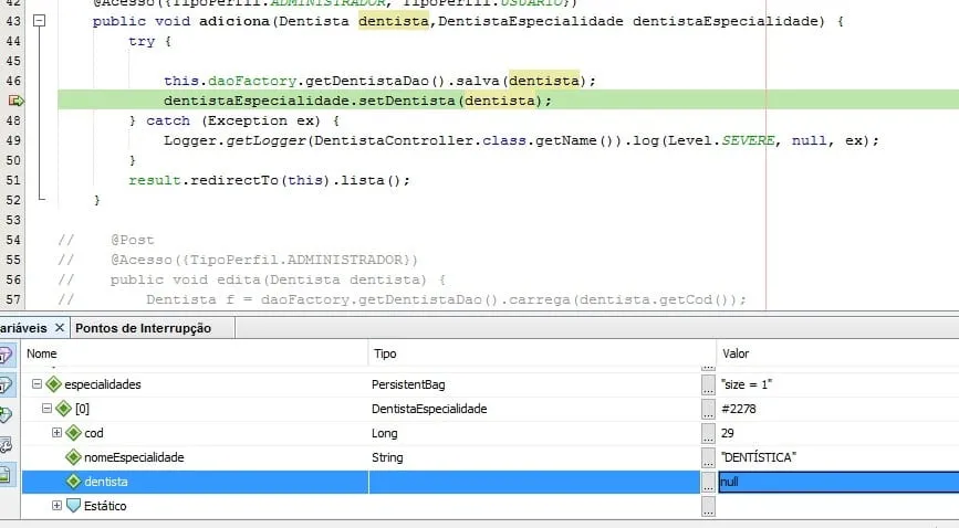 @Post @Acesso({TipoPerfil.ADMINISTRADOR, TipoPerfil.USUARIO}) public void adiciona(Dentista dentista) { try { this.daoFactory.getDentistaDao().salva(dentista); } catch (Exception ex) { Logger.getLogger(DentistaController.class.getName()).log(Level.SEVERE, null, ex); } result.forwardTo(this).lista(); }