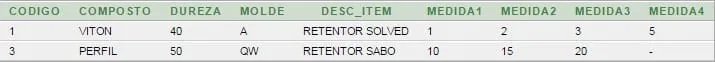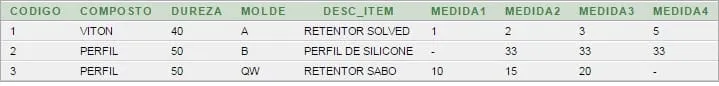 String sql = "SELECT codigo, composto, dureza, molde, desc_item, medida1, medida2, medida3,"