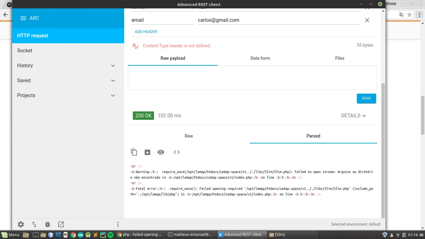 Estou desenvolvendo um servidor em PHP utilizando o framework Slim e ao testar o mesmo em uma extensão do Chrome foi retornado um erro sobre a localização de um arquivo. Alguém pode me ajudar?