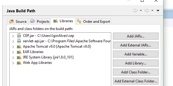 Criei um projeto para um Servlet chamar um método de uma classe em um arquivo .jar, adicionei o arquivo em “Java build path” mas não consigo usar a classe, o eclipse da erro e pede para eu criar a classe. como resolver?
