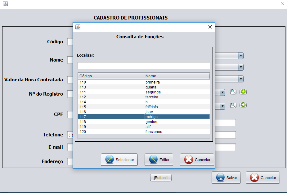 Tenho uma tela de cadastro de profissional, onde tenho um JComboBox com algumas funções, esse combobox está populado com as funções que estão cadastradas no banco de dados.