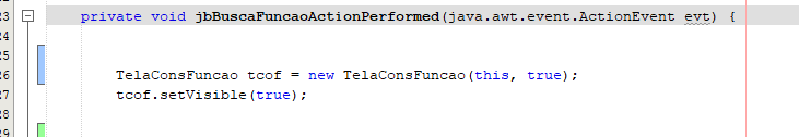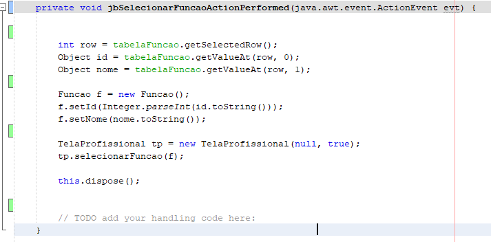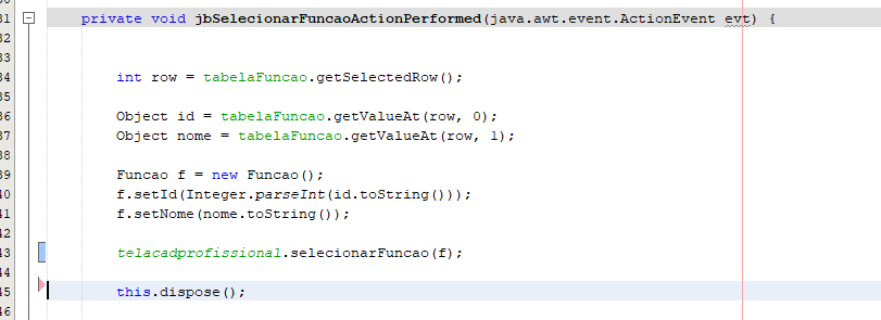 Esse é o código que tenho no botão selecionar, onde pego os valores da linha selecionada e uso para popular um objeto Funcao, em seguida chamo a a funcao selecionarFuncao() que está presente na miha TelaProfissional e passo como parâmetro o objeto função que acabei de setar.