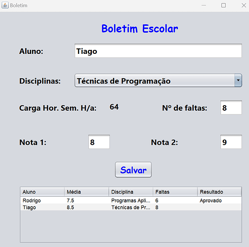 Desenvolvi um sistema simples de boletim escolar. Conforme os dados são inseridos nas textfields ao clicar no botão Resultado, deverá mostrar em uma JTable. O problema é que a última coluna (resultado) da JTable tem que estar dentro de uma condição if/else para setar se o aluno está “aprovado”, “em recuperação” ou “reprovado conforme a condição”. Estou com dificuldades em descobrir qual é o método correto que seta este resultado de forma dinâmica. Segue o código: