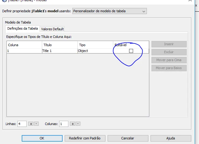 Vá nas propriedades da sua JTable e vá em Model.