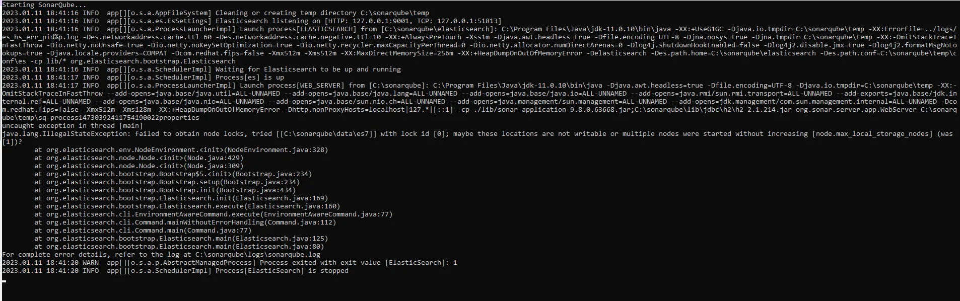 2023.01.11 18:27:37 INFO app[][o.s.a.ProcessLauncherImpl] Launch process[ELASTICSEARCH] from [C:\sonarqube\elasticsearch]: C:\Program Files\Java\jdk-11.0.10\bin\java -XX:+UseG1GC -Djava.io.tmpdir=C:\sonarqube\temp -XX:ErrorFile=../logs/es_hs_err_pid%p.log -Des.networkaddress.cache.ttl=60 -Des.networkaddress.cache.negative.ttl=10 -XX:+AlwaysPreTouch -Xss1m -Djava.awt.headless=true -Dfile.encoding=UTF-8 -Djna.nosys=true -Djna.tmpdir=C:\sonarqube\temp -XX:-OmitStackTraceInFastThrow -Dio.netty.noUnsafe=true -Dio.netty.noKeySetOptimization=true -Dio.netty.recycler.maxCapacityPerThread=0 -Dio.netty.allocator.numDirectArenas=0 -Dlog4j.shutdownHookEnabled=false -Dlog4j2.disable.jmx=true -Dlog4j2.formatMsgNoLookups=true -Djava.locale.providers=COMPAT -Dcom.redhat.fips=false -Xmx512m -Xms512m -XX:MaxDirectMemorySize=256m -XX:+HeapDumpOnOutOfMemoryError -Delasticsearch -Des.path.home=C:\sonarqube\elasticsearch -Des.path.conf=C:\sonarqube\temp\conf\es -cp lib/* org.elasticsearch.bootstrap.Elasticsearch