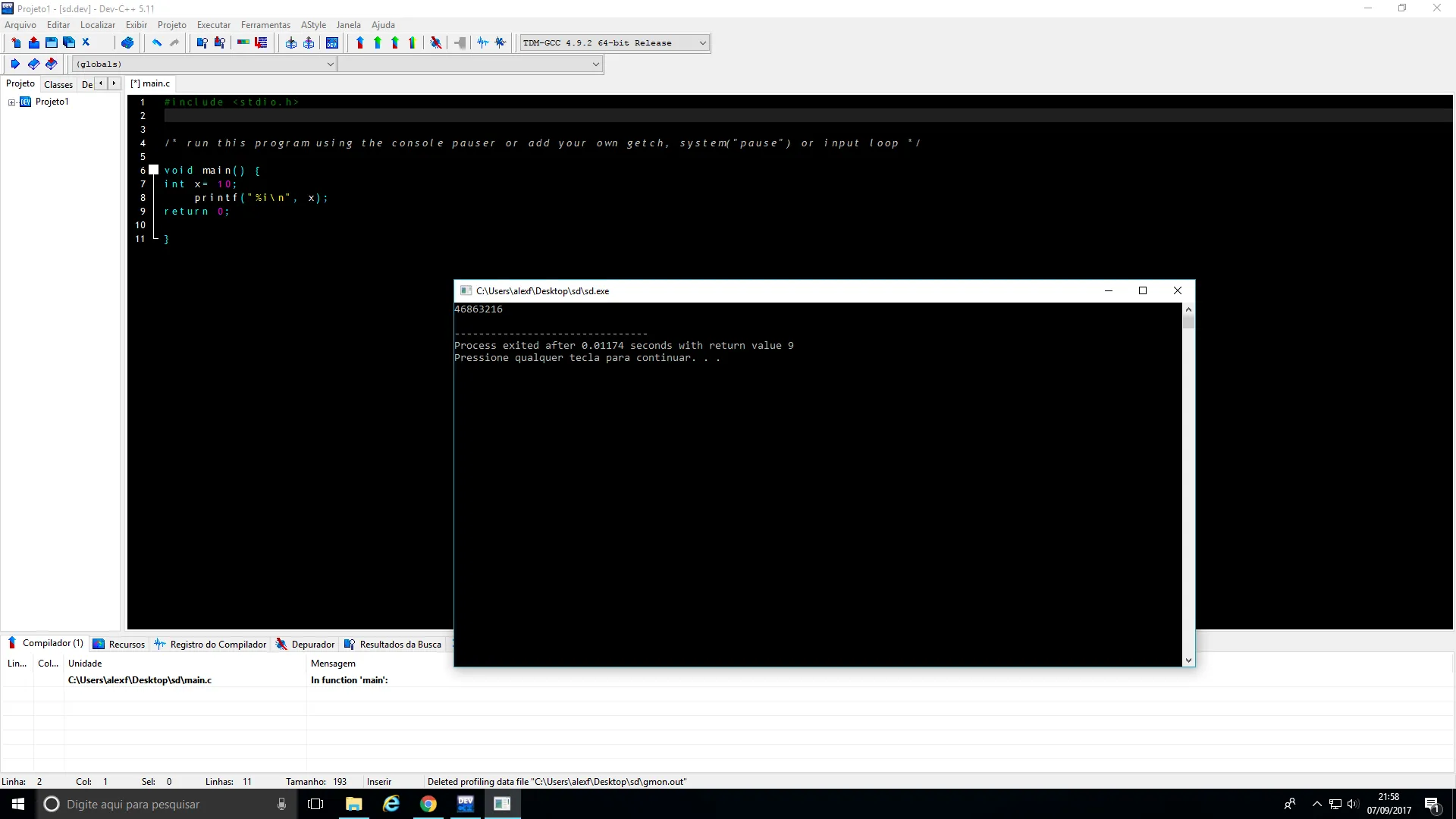 O programa não encerrou corretamente, ali mostra que ele terminou com valor de retorno 9, o correto seria 0.