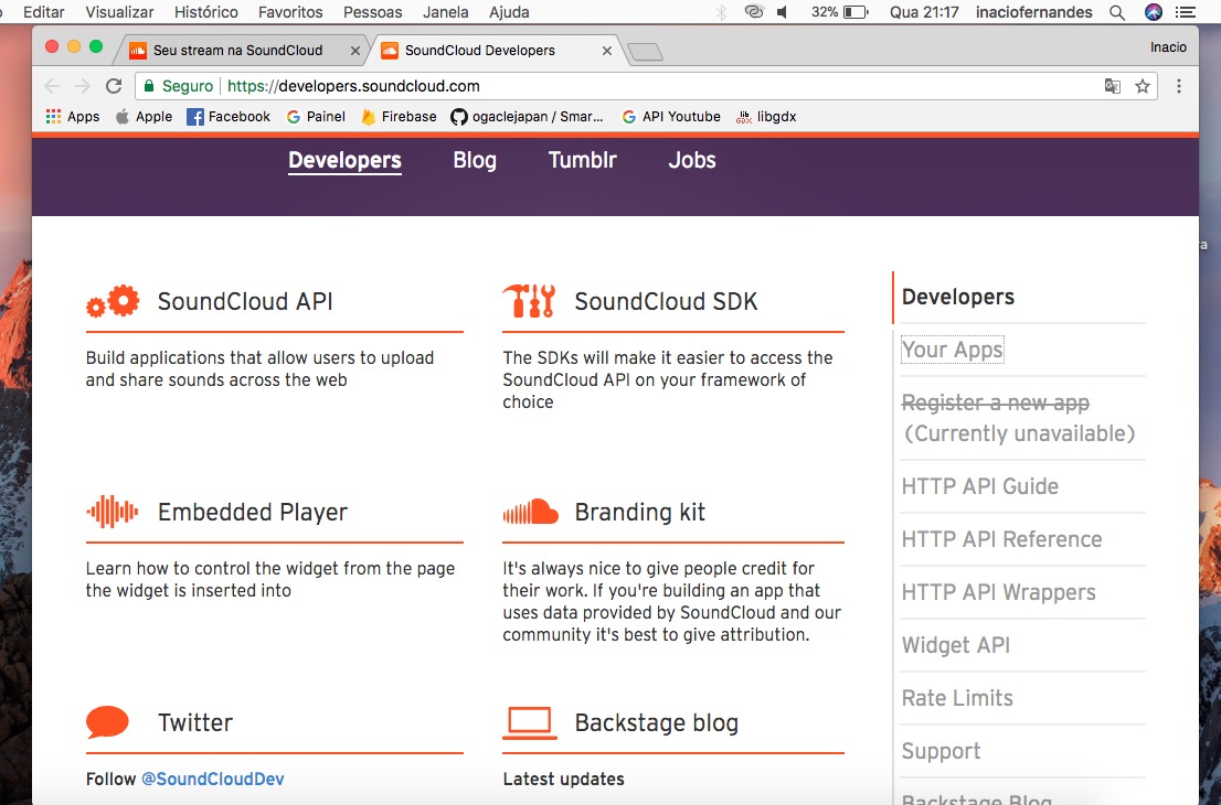 Boa noite hoje eu estava aplicando o recurso da SoundCloud ao meu projeto mais infelizmente me deparei com essa msg Registro um novo app(indisponível no momento) , alguém sabe quanto tempo vai ficar indisponível, pq estou com um tempo apertado para esse app, alguém tem outra ideia de como faço, quero adicionar as músicas e ter a opção de baixar