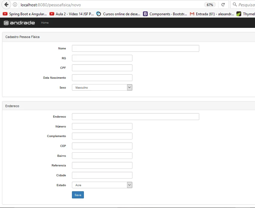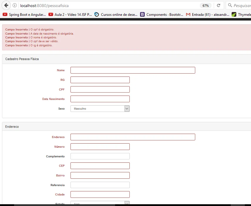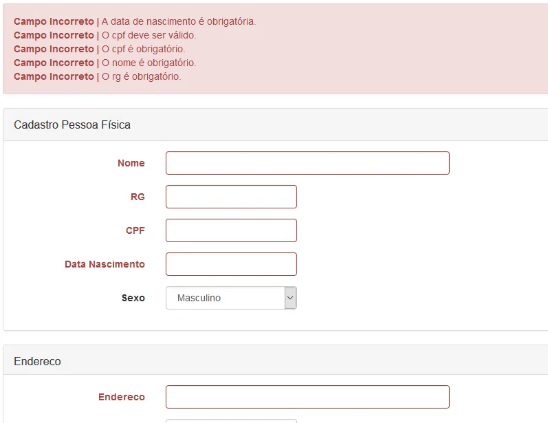 Minha Tela com as Mensagens de Erro da Classe PessoaFisica, porém as Mensagens da classe Endereco não aparecem, mas válida deixando o campo em vermelho.