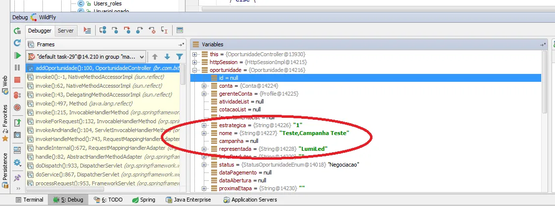 Quando eu vou verificar os dados usando o DEBUG, o atributo nome contém “teste, CAMPANHA TESTE” e o atributo campanha contem null.