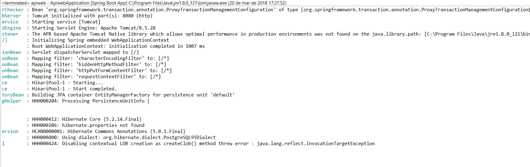 2018-03-19 19:21:40.708 INFO 5172 --- [ost-startStop-1] o.a.catalina.core.AprLifecycleListener : The APR based Apache Tomcat Native library which allows optimal performance in production environments was not found on the java.library.path: [C:\Program Files\Java\jre1.8.0_121\bin;C:\WINDOWS\Sun\Java\bin;C:\WINDOWS\system32;C:\WINDOWS;C:/Program Files/Java/jre1.8.0_121/bin/server;C:/Program Files/Java/jre1.8.0_121/bin;C:/Program Files/Java/jre1.8.0_121/lib/amd64;C:\ProgramData\Oracle\Java\javapath;C:\Windows\system32;C:\Windows;C:\Windows\System32\Wbem;C:\Windows\System32\WindowsPowerShell\v1.0\;C:\Program Files (x86)\NVIDIA Corporation\PhysX\Common;C:\WINDOWS\system32;C:\WINDOWS;C:\WINDOWS\System32\Wbem;C:\apache-maven-3.3.9\bin;C:\Program Files\MySQL\MySQL Server 5.7\bin;C:\WINDOWS\System32\WindowsPowerShell\v1.0\;C:\Program Files\MySQL\MySQL Utilities 1.6\;C:\Program Files\Git\cmd;C:\ProgramData\Oracle\Java\javapath;C:\Windows\system32;C:\Windows;C:\Windows\System32\Wbem;C:\Windows\System32\WindowsPowerShell\v1.0\;C:\Program Files (x86)\NVIDIA Corporation\PhysX\Common;C:\WINDOWS\system32;C:\WINDOWS;C:\WINDOWS\System32\Wbem;C:\apache-maven-3.3.9\bin;C:\Users\marco\AppData\Local\Microsoft\WindowsApps;C:\Users\marco\AppData\Local\Microsoft\WindowsApps;;D:\Eclipse\Eclipse Spring\sts-bundle\sts-3.9.2.RELEASE;;.]