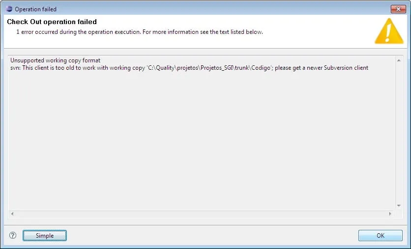 Sempre que tento baixar um projeto do SVN pelo Eclipse, dá o seguinte erro (imagem em anexo).