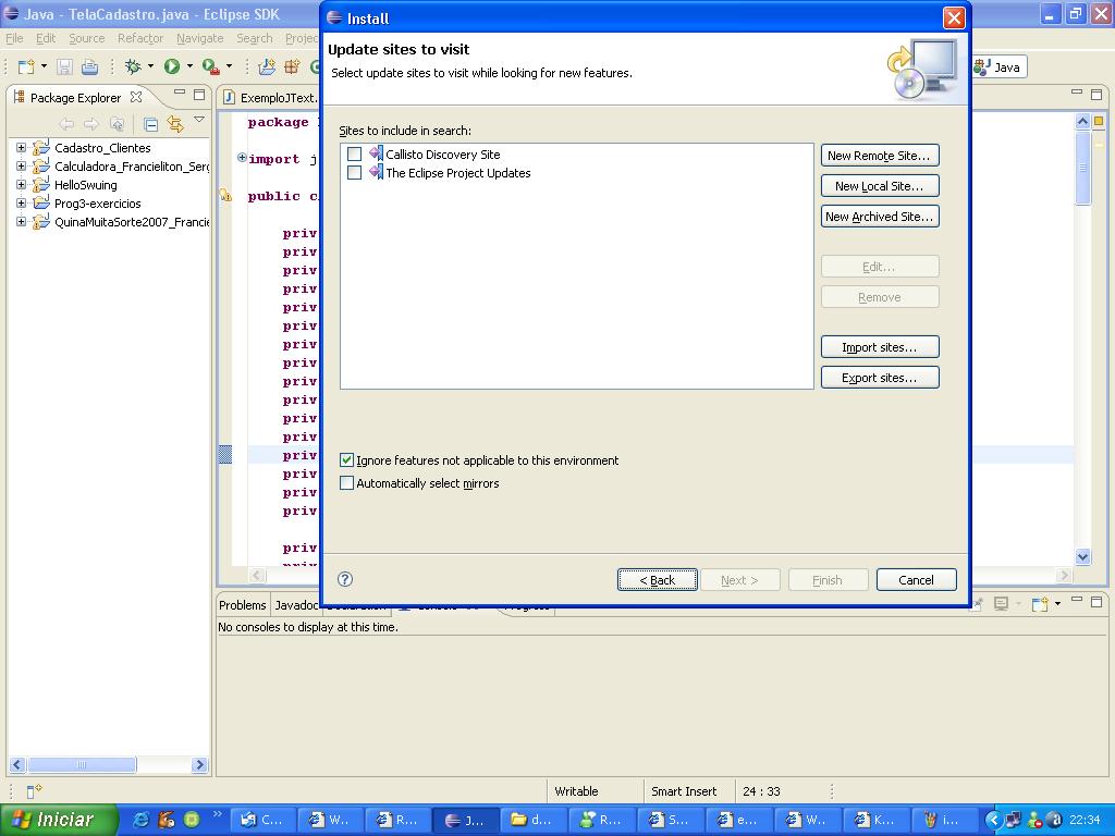 cara acessei o site do eclipe, baixei os plugins pro meu eclipse que é a versão 3.2.2, mas no momento da atualizacao ele apresenta uma tela que nao tem como fazer ou eu nao encontrei como fazer esta etapa (5- Cada arquivo descompactado possui uma pasta chamada ‘eclipse’, Selecione esta pasta. Faça este procedimento para todos os plugins descompactados). aki está a tela… eu vasculhei a internet mas nao consegui encontrar nada referente a atualizao dos plugins…
