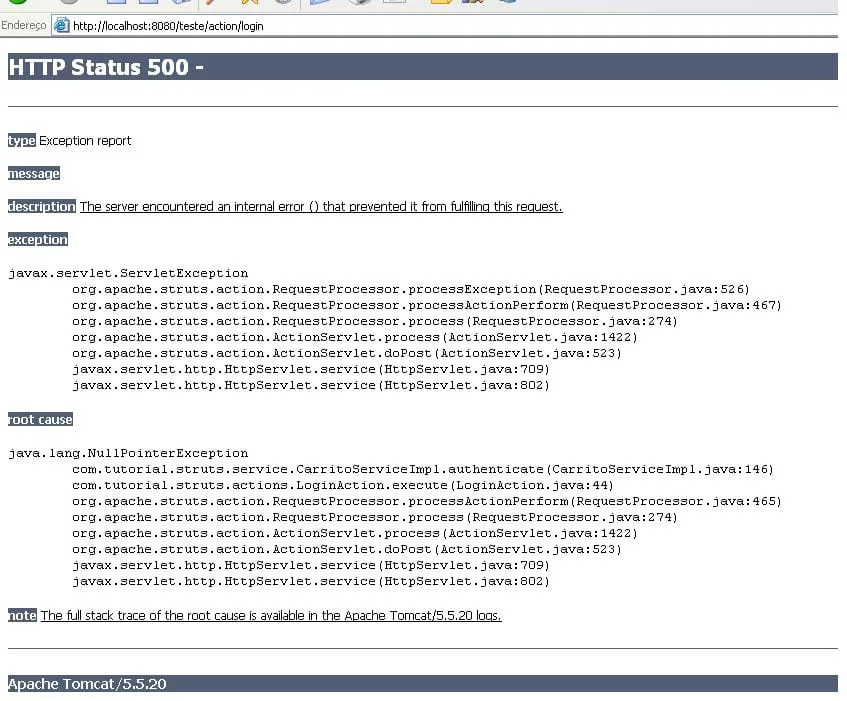Gostaria de uma ajuda com tomcat + struts + mysql, estou estudando java e tentando entender um código, mas esta ocorrendo um erro.