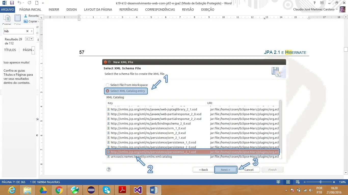 Pessoal estou avançado nos estudo bom agora estou criando um projeto usando o Hibernate bom segui tudo como o tutorial ensinou baixei a biblioteca no site oficial peguei criei um novo projeto add uma pasta chamada lib e coloquei os arquivo neles incluindo o do mysq, add o path, criei uma pasta chama META-INF para criar o arquivo persistence.xm digitei o nome do arquivo mandei dar next na proxima tela selecionei a opção de “Create XML file from an XML schema file” dei next na proxima tela selecionei o “Select XML Catalog entry” e minha supresa não veio aparece está lista de arquivos persistence o que fiz de errado: